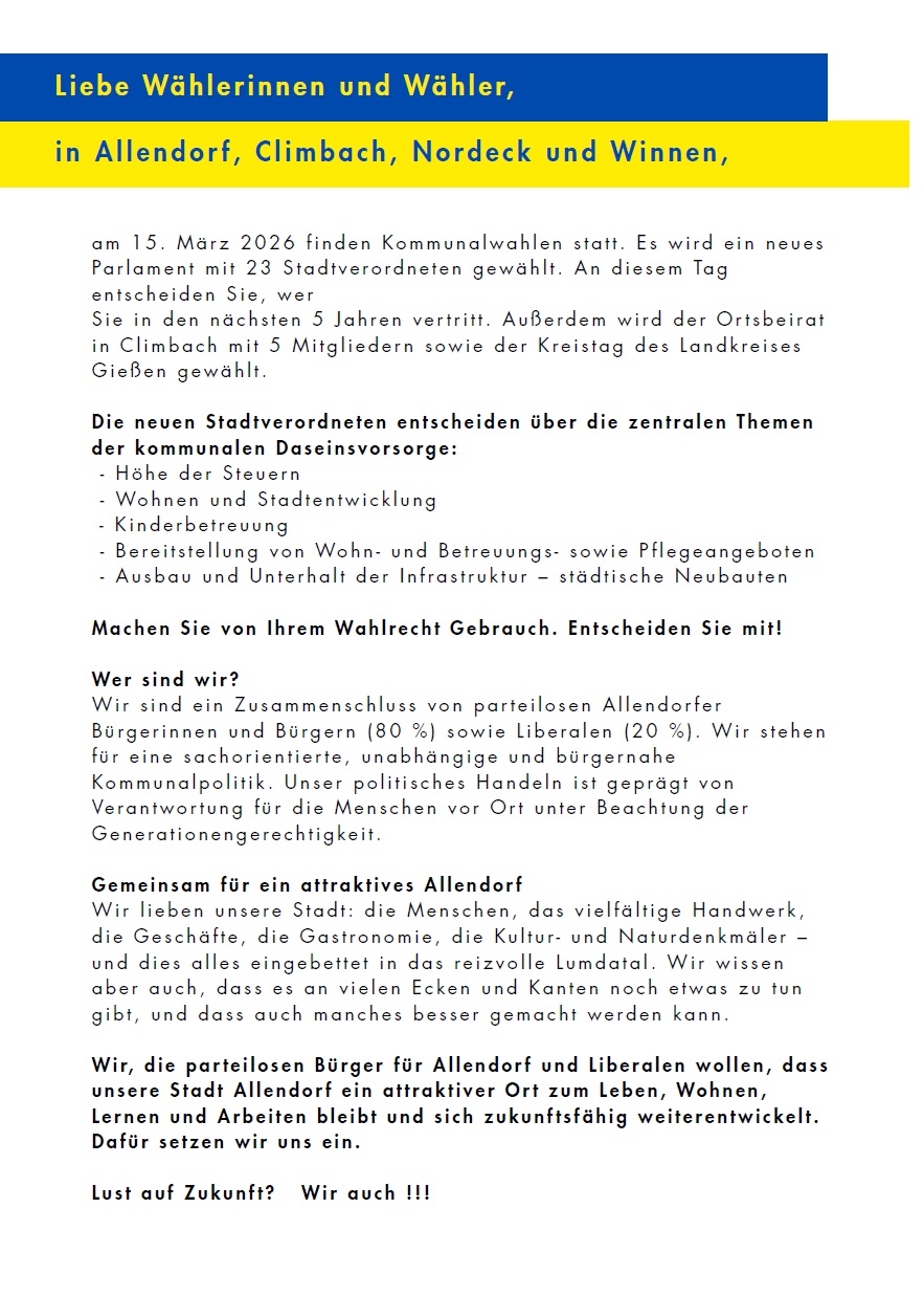 Die Bürger für Allendorf stehen für unabhängige, sachorientierte und bürgernahe Kommunalpolitik in Allendorf (Lumda).